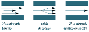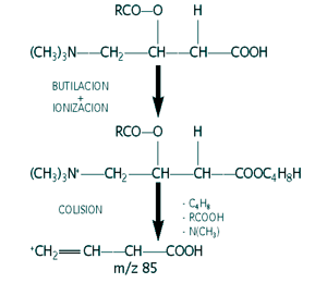El primer paso en cualquier análisis usando EMT es generar especies cargadas (iones + ó -), de ese modo el analito que atraviesa el espectrómetro de masa puede ser controlado cuidadosamente. Dichos iones son obtenidos por una técnica de ionización suave: electrospray en la cual la mayoría de las especies observadas corresponden al peso molecular del analito de interés más una carga, ([M+H]+) o menos una carga, ([M-H]-); según sea su capacidad para ceder o aceptar protones. Durante un análisis típico, la fase móvil que fluye desde una bomba HPLC a muy bajo caudal (10 µl/min) arrastra la muestra hacia la fuente de ionización electrospray y allí, utilizando nitrógeno como gas de nebulización y aplicando un alto voltaje, se obtienen las especies cargadas. El espectrómetro de masa está constituido por dos cuadrupolos (analizadores) acoplados en tándem y separados por una celda de colisión hacia donde van a ser conducidos los iones, esta disposición de los analizadores permite obtener resultados altamente selectivos y específicos. Para procesos de cuantificación se utilizan los isótopos marcados de los analitos de interés debido a que ambos, al ser sometidos a la ionización, poseen el mismo comportamiento, y la relación entre las respuestas generadas por ellos será proporcional a su concentración en la muestra analizada. Las acilcarnitinas y los aminoácidos son extraídos de gotas de sangre impregnadas en papel de filtro, a través de una solución metanólica que contiene los estándares internos deuterados, (isótopos marcados de la especies a analizar). El extracto es evaporado bajo nitrógeno y luego derivatizado con n-butanol en ácido clorhídrico para obtener los ésteres butilícos de dichas especies. La muestra derivatizada es evaporada nuevamente bajo nitrógeno hasta sequedad y finalmente reconstituida con una solución de acetonitrilo y agua que contenga 0.1% de ácido fórmico para facilitar la ionización. Acilcarnitinas Los ésteres butílicos de las acilcarnitinas pueden ser estudiados dado que todas estas especies moleculares sometidas a la fragmentación generan un ion fragmento común cuya relación masa / carga (m/z) es de 85. El proceso de fragmentación se lleva a cabo en la celda de colisión con argón. El perfil de acilcarnitinas proviene de hacer un barrido con el primer cuadrupolo o analizador y sólo permitir que pase al segundo analizador el ion fragmento m/z:85, generado en la celda de colisión. En términos de espectrometría de masa esto es denominado barrido de iones precursores o de iones padres.