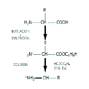 Aminoácidos Un gran número de aminoácidos (no todos) pueden ser analizados usando EMT. La fragmentación de los aminoácidos esterificados es distinta a la de las acilcarnitinas. En este caso las especies moleculares de interés pierden un fragmento común neutro (sin carga) de 102 Da. El perfil de aminoácidos proviene de hacer un barrido simultáneo entre el primer y el segundo cuadrupolo con una diferencia entre las masas del primer cuadrupolo y las masas del segundo, estipulada en 102 Da (pérdida del fragmento neutro). La única ocasión en que un ion va a ser detectado es cuando el fragmento generado en la celda de colisión resulte de una pérdida neutra del ion precursor. En términos de espectrometría de masa esta detección se denomina pérdida neutra constante de 102 Da. |